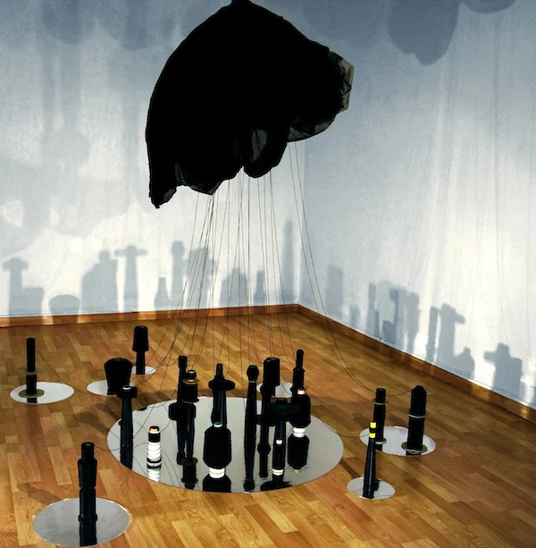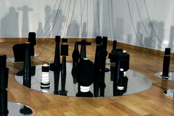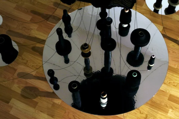 The installation consists of two main elements. In the center of the space hangs a black constructed cloud with attached black thread lines that originate from the shapely spools of black thread below. These individually wrapped spools sit on highly reflective circular discs. The counterpoint to this constructed and highly controlled central piece is the shadowy cityscape that appears on the surrounding walls. Tethered to looming shadowy clouds this phantom urban landscape is shaped by the placement of wall-mounted lighting directed at the central construction.