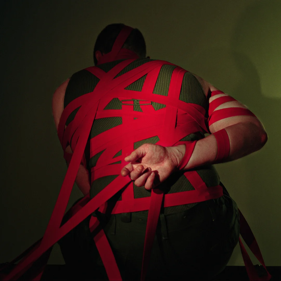 Houdini and the Red Suspenders is a 1:50 minute video projection with sound. It begins with an amateur performer studying archival footage of Houdini, once the world’s greatest magician, doing his straightjacket escape of 1923. As the performer watches Houdini, he begins to perform his own escape act that quickly goes awry. Suspended in an absurd situation from which he can’t escape, his failed attempts get repeated over and over while Houdini continuously repeats his escape successfully. The sound component is a recorded piano accompaniment used in silent films of the era.