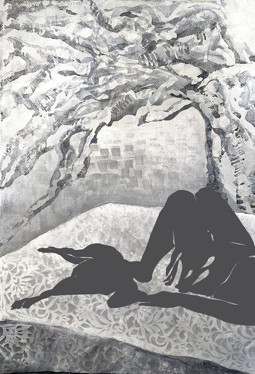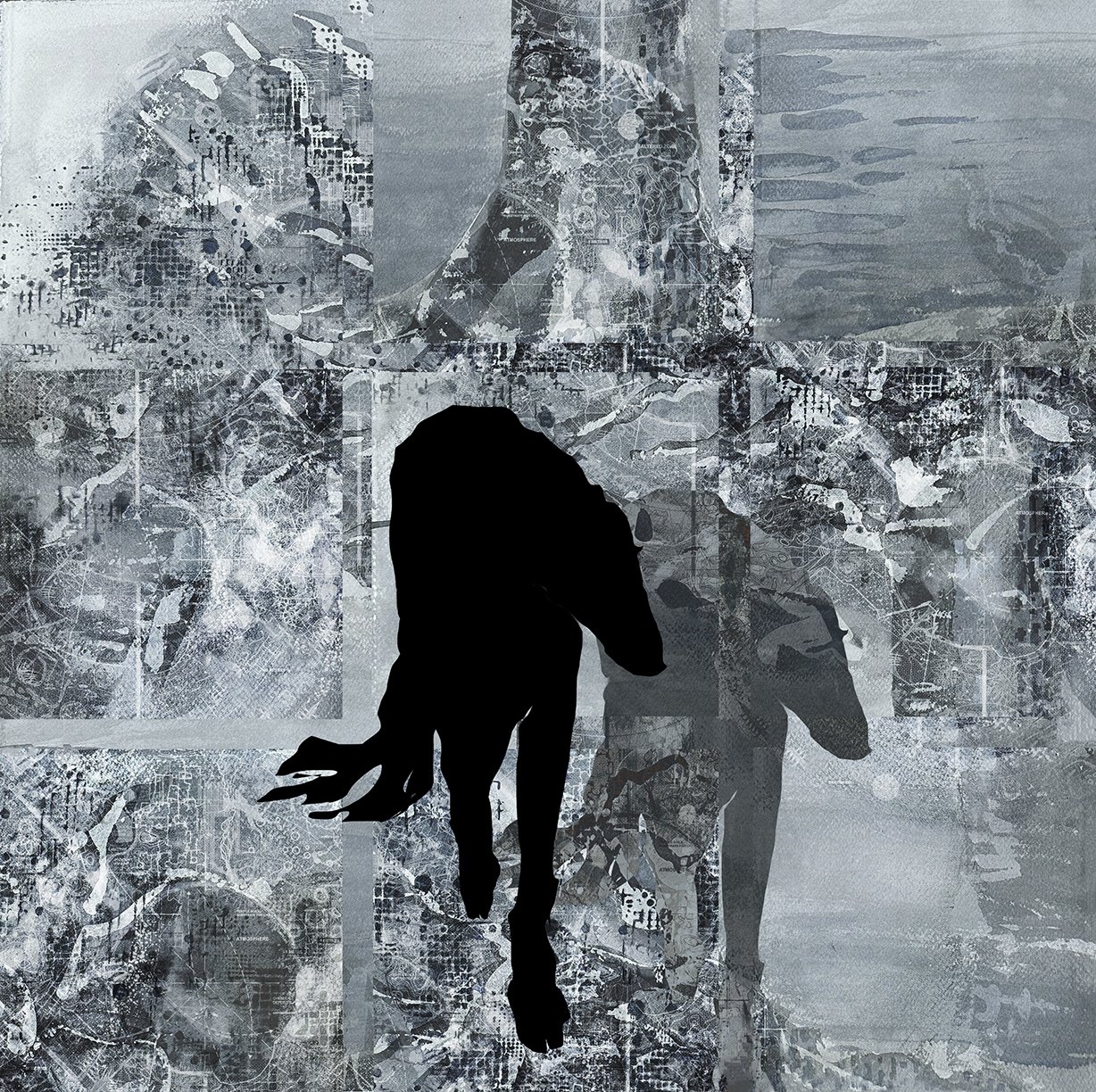 Where Do Boundaries Lie combines paint and print. A photographic silhouette is overlaid on a painted landscape background producing a hybrid image.